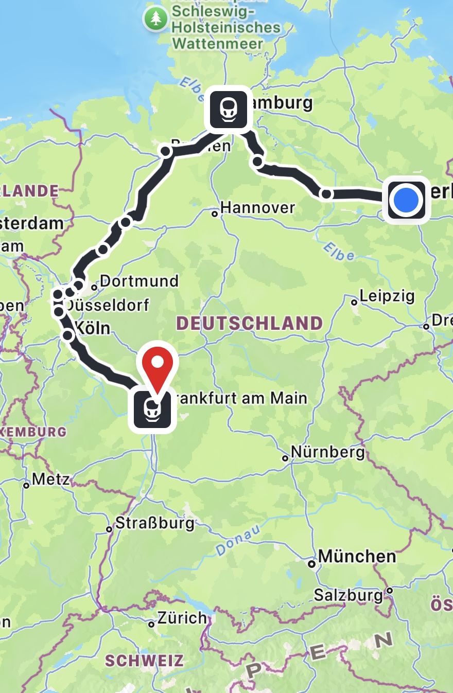 Nach einem kurzen Blick auf Köln rasen wir das letzte Stück ohne Halt bis zum Frankfurter Flughafen.